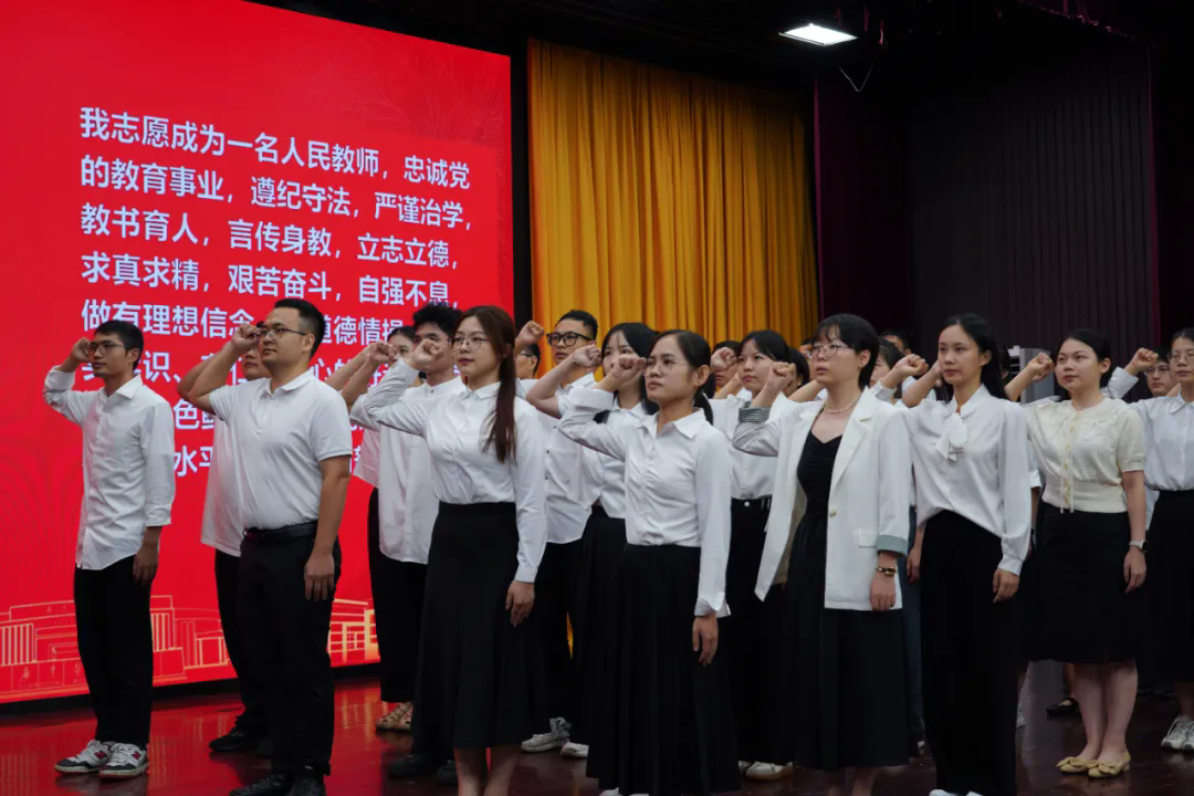 在表彰大会上新进教师庄严宣誓:“我志愿成为一名人民教师,忠诚党的教育事业,遵纪守法,严谨治学,教书育人,言传身教,立志立德,求真求精,艰苦奋斗,自强不息,做有理想信念、有道德情操、有扎实学识、有仁爱之心的好老师,为建成特色鲜明、同类先进、国内知名的高水平医科大学而努力奋斗。”