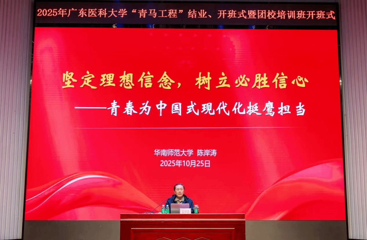 开班仪式结束后,开班“第一讲”随即而来。华南师范大学教授、博士生导师陈岸涛教授作客首讲,为学员们带来《坚定理想信念,树立必胜信心——青春为中国式现代化挺膺担当》的专题讲座,从解读马克思主义、读懂中国共产党的理论根基出发,结合党的二十届四中全会公报学习,串联历史与现实、理论与实践的脉络,紧扣世界百年未有之大变局与中华民族伟大复兴战略全局两大变局,围绕坚定理想信念、梳理必胜信心以及抓住时代机遇为时代增光添彩、借复兴契机勇担使命等方面,解读理想信念的时代内涵,指引青年学子如何以行动为中国式现代化建设贡献青春力量,深入浅出,饱含深意,为学员们补足了理想信念之钙,为培训班拉开完美序幕。