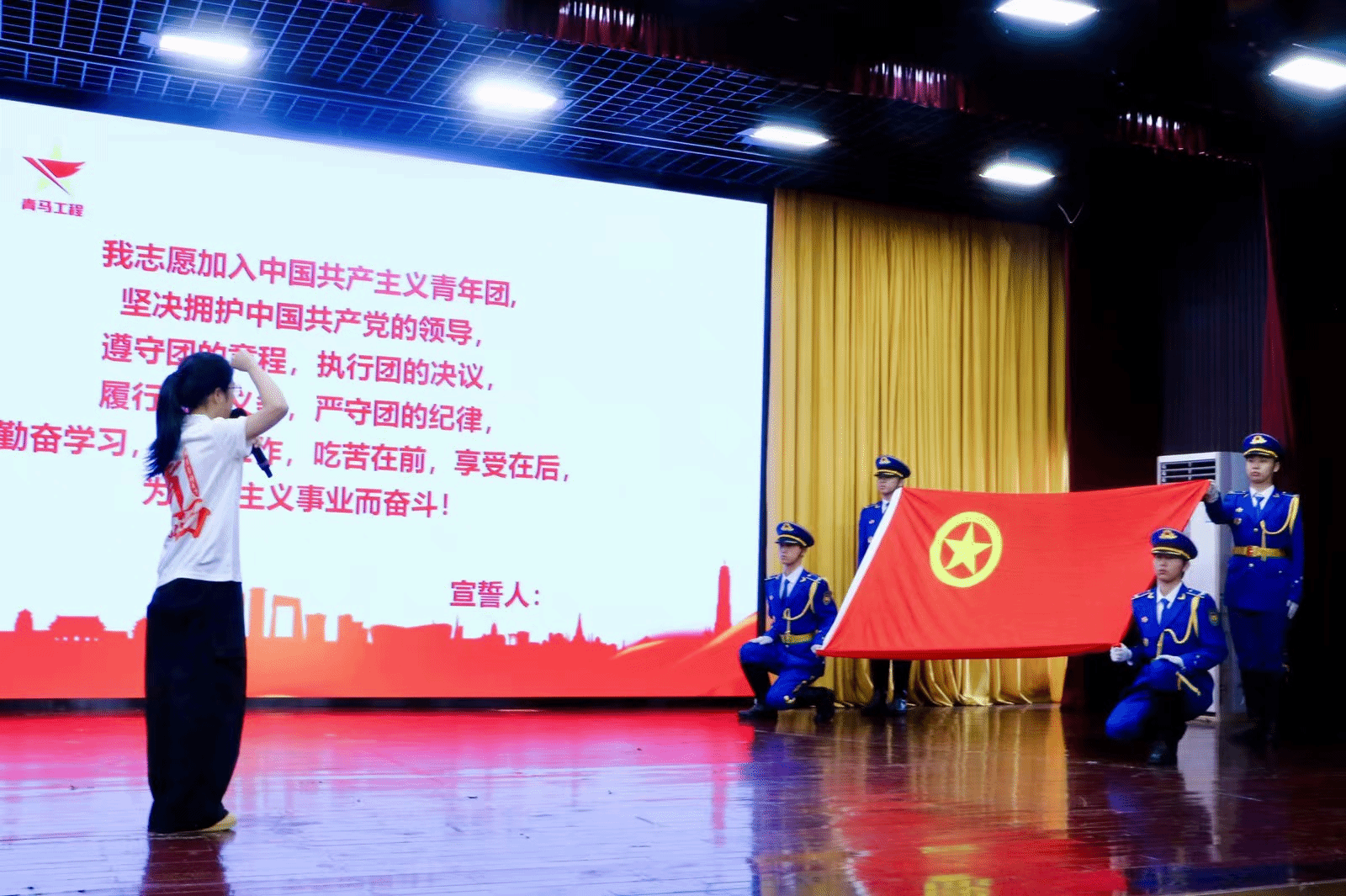 本届培训班新学员陆虹宇同学作为代表发言,在其带领下,全体参训学员重温入团誓词,在铿锵有力的青春誓言中坚定信念、信仰。