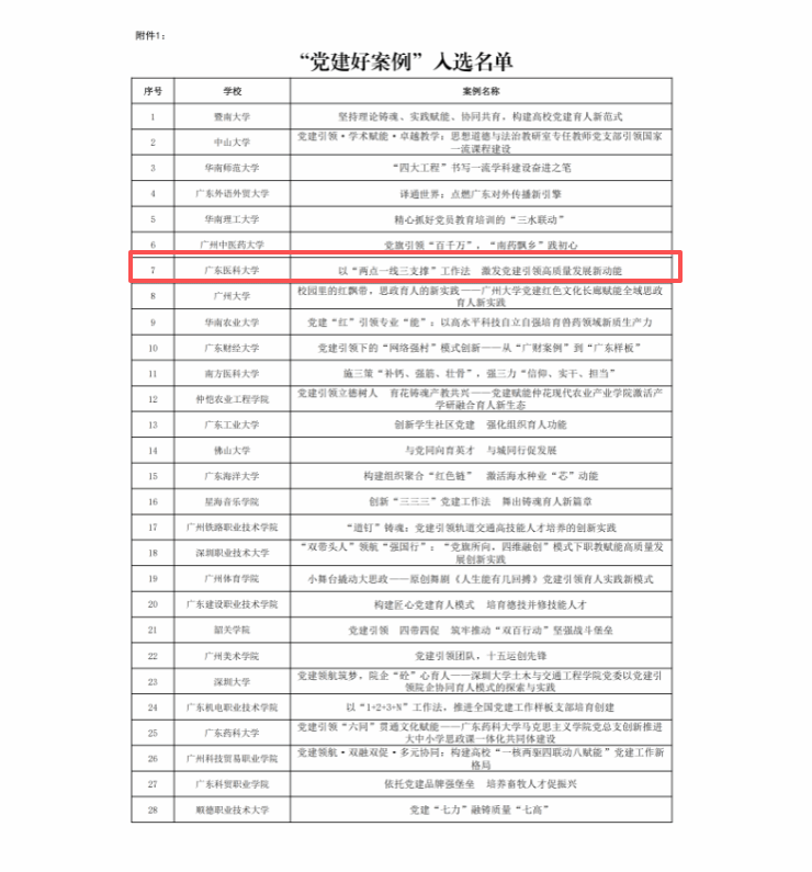 近日,广东省委教育工委公布“党建好案例、书记好党课、党员好榜样”优秀成果入选名单,beat365体育官网报送的党建工作案例《以“两点一线三支撑”工作法 激发党建引领高质量发展新动能 》入选“党建好案例”,成为全省教育系统基层党建工作的示范成果之一。