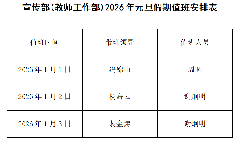 宣传部(教师工作部)2026年元旦假期值班安排表