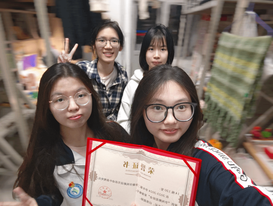 此外,宿舍成员还积极投身社会实践,其中莫柑苹同学作为队伍队长,所带队伍“相约地贫线三下乡服务队”获院立项答辩二等奖和优秀队伍、校级一般立项和优秀调研报告,个人获校三下乡优秀个人;方妙旋同学所在队伍“青心三下乡服务队”获院立项、2024年粤港澳大湾区暑期“三下乡”成果汇报暨“百千万工程”突击队三等奖。4人i志愿平台共累计志愿时长1326小时。