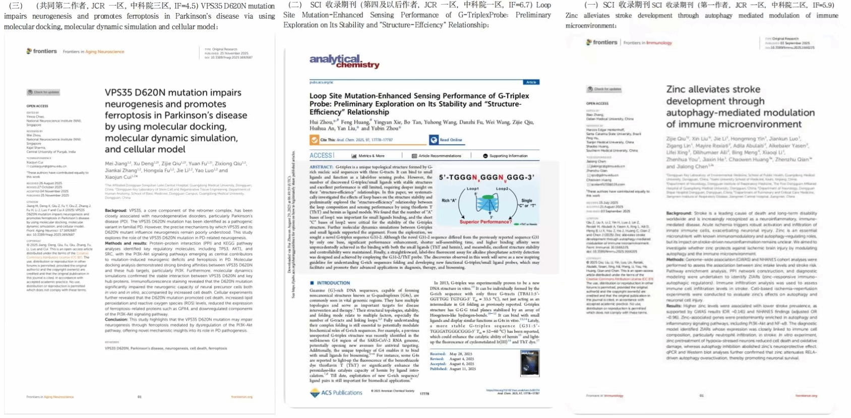 作为一名新时代医学生,他始终秉持 “求真求实” 的科研态度,在医学科研的道路上勇毅前行,科研创新能力尤为突出。他以第一作者及共同作者在SCI期刊(JCR一区)发表论文3篇,聚焦神经系统疾病领域,贯穿机制-诊断-干预,为脑卒中,阿尔兹海默症防治提供新策略。