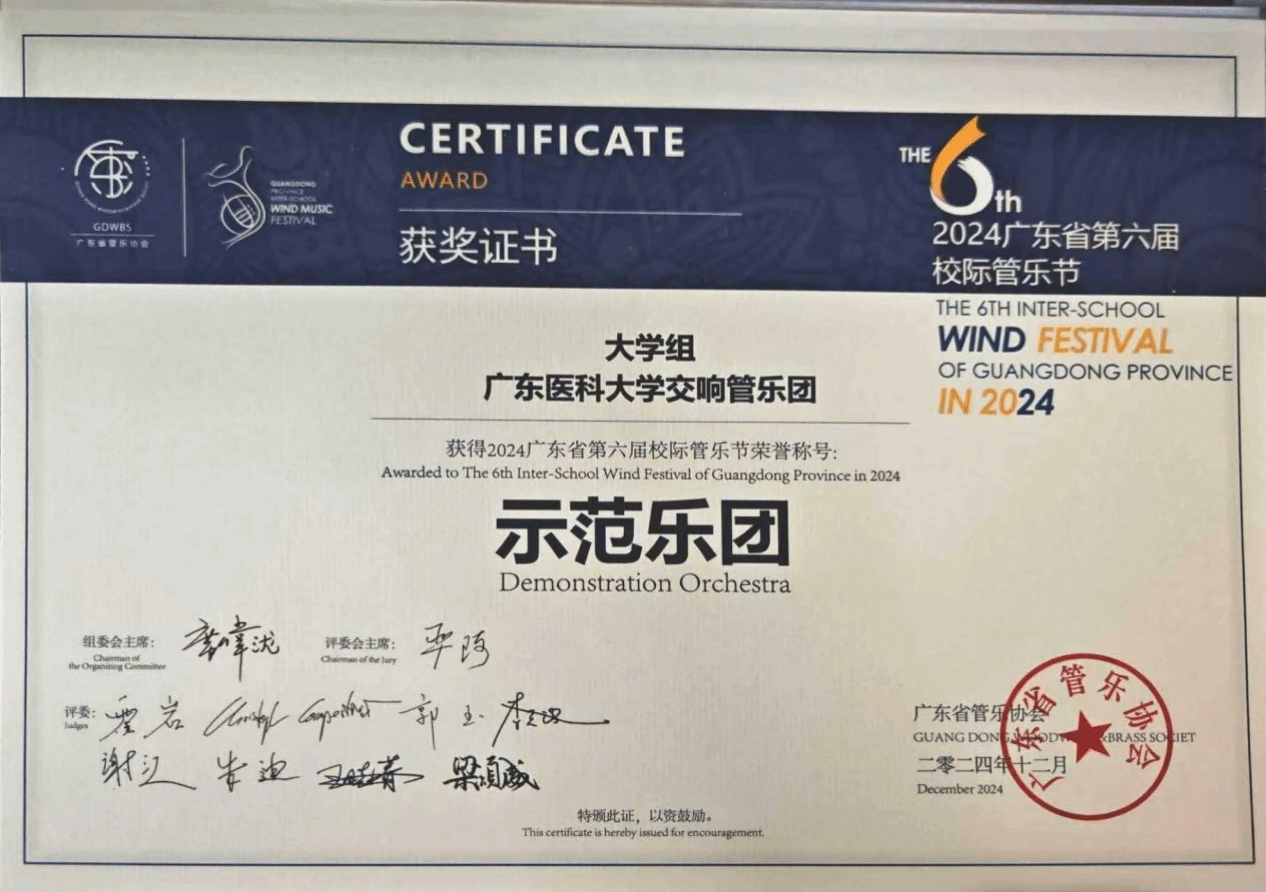 他在文体领域绽放别样光彩,让医学成长之路充满跳动的音符与蓬勃的活力。曾任校管乐团团长的他,组织松山湖建湖20周年、beat365体育官网在东莞办学20周年等大型演出6场,带领校管乐团斩获2024广东省第六届校际管乐节 “示范乐团” 荣誉称号;现任校排舞队副队长,他与队员们刻苦训练,斩获2024年广东省排舞锦标赛暨广东省校园排舞锦标赛大学甲组两项特等奖、一项一等奖,让广东医的青春风采绽放在省级赛场。